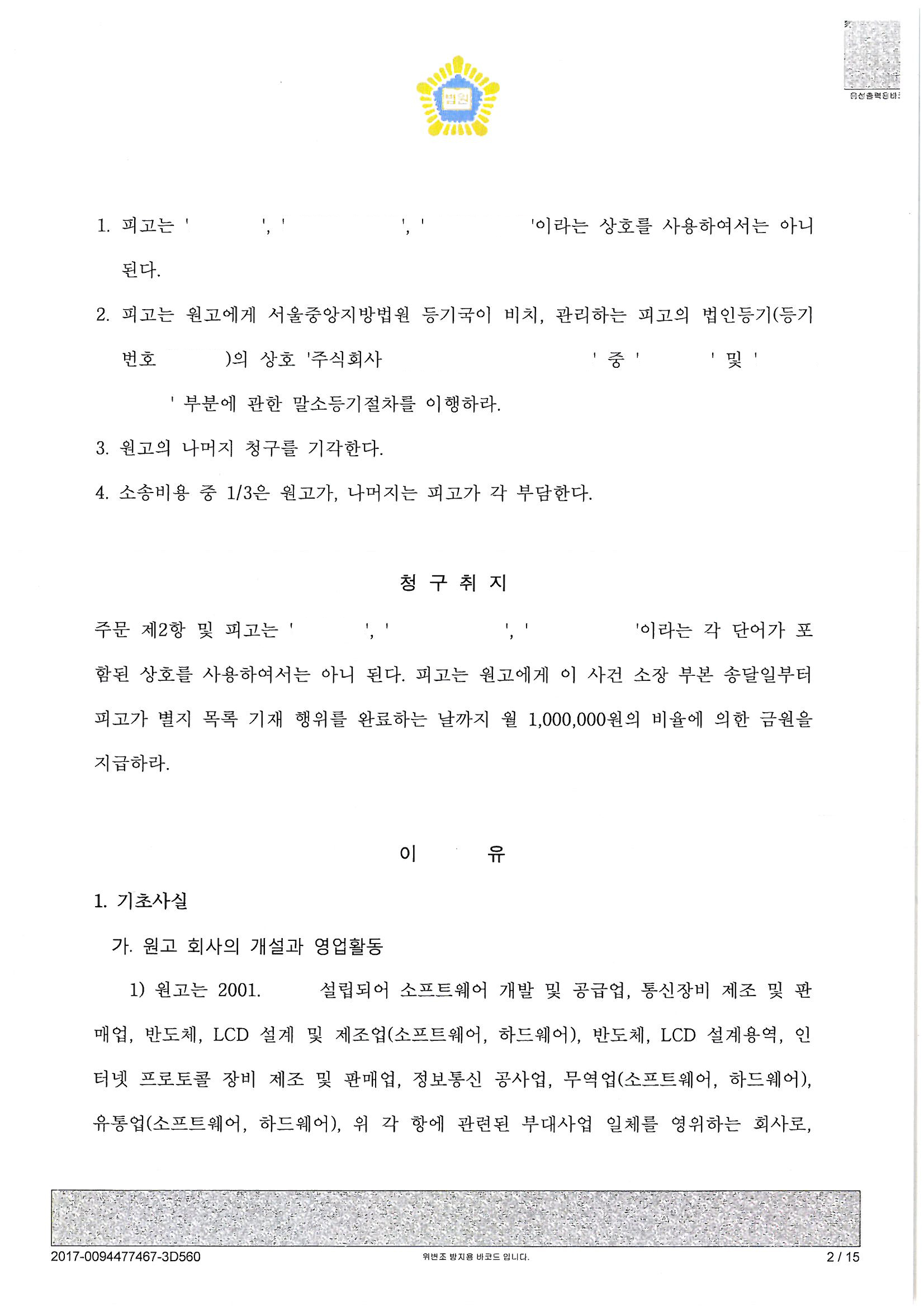 상호사용금지 등 청구를 하여 전부 승소에 가까운 일부승소를 한 사건입니다.