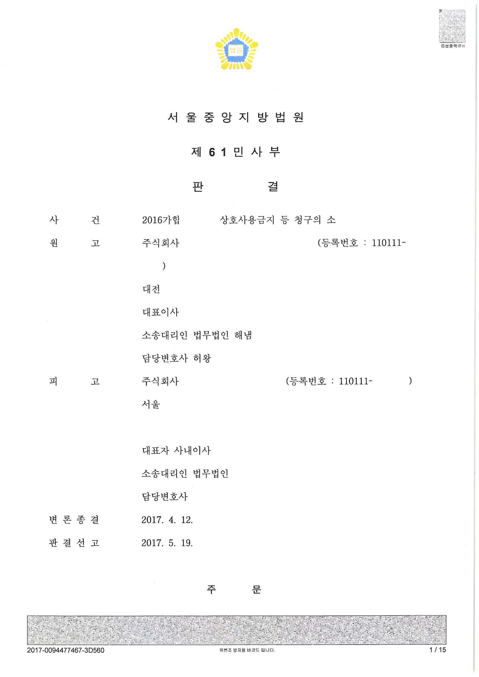 2017. 5. 중순에 1심 승소판결을 이끌어내었습니다.